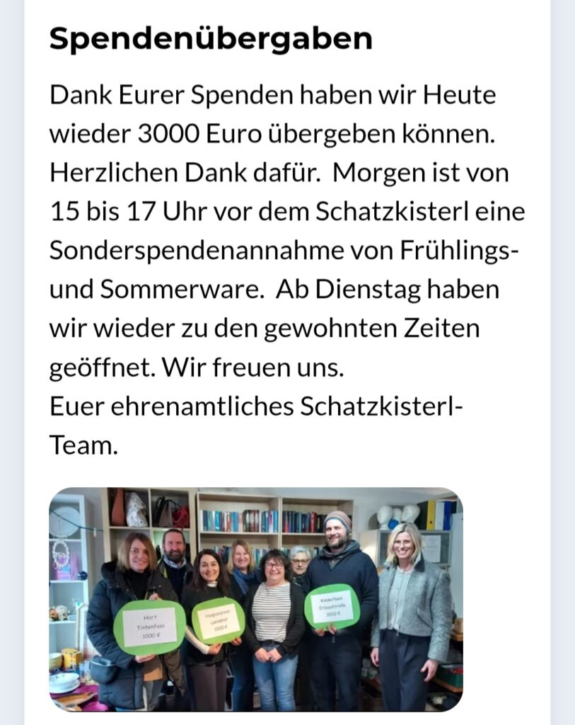 Am Dienstag, 18. November 25 öffnen wir unseren Laden von 17:00 – 19:30 Uhr (am Nachmittag haben wir geschlossen). Wir möchten mit dieser späten Öffnung den Berufstätigen und den Schülern Gelegenheit geben, sich in aller Ruhe im Schatzkisterl umzuschauen oder auch Spenden abzugeben.