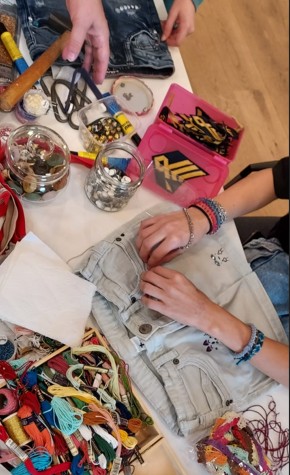 Neben dem Reparieren von Alltagsgegenständen wurde Jeanstaschennähen ab 10 Jahren angeboten. Es standen diverse Materialien wie ausgediente Jeans, Borten, Stoffe, Nieten usw. zur Verfügung. Unter Anleitung von 3 Hobbynäherinnen konnten die Taschen genäht und designt. werden. Das Angebot war kostenlos und wurde von 12 Jugendlichen begeistert wahrgenommen. Sie waren sehr aufmerksam und interessiert dabei. Nebenbei wurden ihnen die Funktionen einer Nähmaschine erklärt. Sie lernten die einzelnen Arbeitsschritte kennen. Aus den ausgewählten Materialien sind tolle Unikate entstanden. Die Mädchen wussten genau, wie die Tasche ausschauen sollte und sie hatten tolle Ideen, die Erwachsenen waren tief beeindruckt. In ca. 2 Stunden ohne Handy entstanden so romantische, rockige, gothic-punkig, comic, minimalistische und aufwendige Taschen – die Mädchen waren sehr stolz auf ihre neuen Errungenschaften.